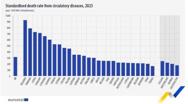 Cele mai mari rate ale mortalității cauzate de boli ale sistemului circulator au fost înregistrate în Bulgaria (923 de decese la 100.000 de persoane), România (787) și Letonia (726).