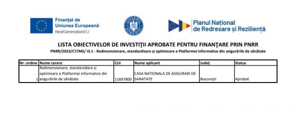 Finanțarea inițială de 70 de milioane de euro a fost majorată la 100 de milioane de euro fără TVA, exclusiv pentru digitalizarea Casei Naționale de Asigurări de Sănătate și optimizarea Platformei Informatice pentru Asigurările din Sănătate (PIAS). Trimestrul trei din 2025 este data limită până la care, incremental, sistemul asigurărilor de sănătate va fi transformat digital.