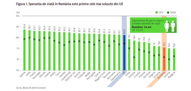Deși speranța de viață la naștere în România a crescut cu mai mult de patru ani în perioada 2000-2017 (de la 71,2 ani la 75,3 ani), aceasta rămâne printre cele mai scăzute din UE și cu aproape șase ani sub media UE (80,9 ani), arată datele Raportului privind Starea de Sănătate în Uniunea Europeană 2019, dat publicității joi de Comisia Europeană. Practic în 2017, România nu ajunsese la media de speranță de viață a Uniunii Europene din 2000 (77,3 ani).