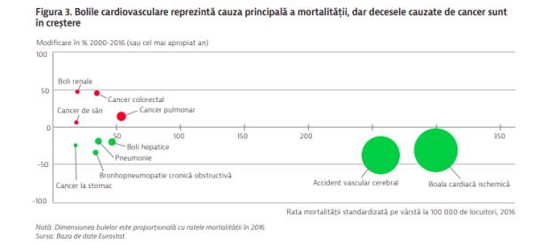 Numărul deceselor cauzate de cancer a crescut, în timp ce bolile cardiovasculare constituie cauza principală a deceselor Boala cardiacă ischemică și accidentul vascular cerebral sunt principalele cauze de deces, reprezentând împreună peste 550 de decese la 100 000 de locuitori în 2016. Rata mortalității cauzate de boala cardiacă ischemică este de aproape trei ori mai mare în România decât în UE în ansamblu. În pofida unei reduceri accentuate începând din anul 2000, accidentul vascular cerebral rămâne a doua cauză de deces, în ordinea importanței, înregistrându-se 256 de decese la 100 000 de locuitori în 2016, mult peste media UE de 80. Cancerul pulmonar reprezintă cea mai frecventă cauză de deces cauzat de cancer, rata mortalității crescând cu aproape 14 % din 2000, în principal din cauza ratelor ridicate ale fumatului. În ultimii ani, au crescut, de asemenea, ratele mortalității legate de alte tipuri de cancer, în special pentru cazurile de cancer colorectal și de cancer de sân.