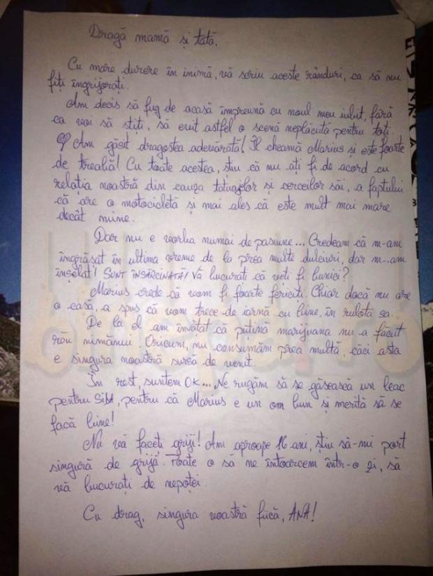 O tanara de aproape 16 ani le-a lasat un bilet parintilor ei in care le explica faptul ca s-a hotarat sa plece de acasa cu iubitul ei mult mai in varsta decat ea. Mai mult, fata marturisea in epistola ca este insarcinata si ca a invatat ca viata este mai frumoasa putina marijuana.