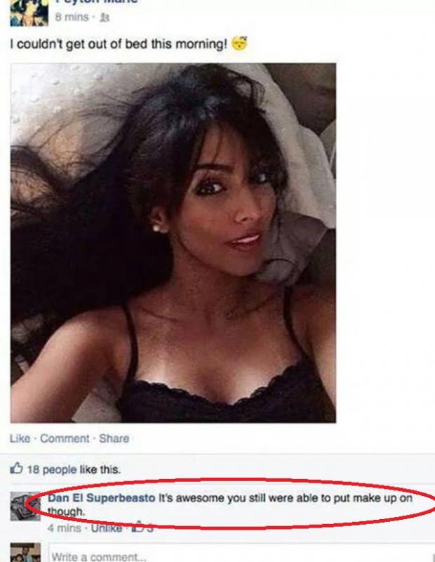Nimic ciudat pana aici. Doar ca unul dintre cei care au vazut poza si-a dat seama de gafa pe care tanara a facut-o, si nu a ezitat sa o taxeze: "Nu ai reusit sa te dai jos din pat, dar e incredibil ca te-ai putut machia!", a comentat el.