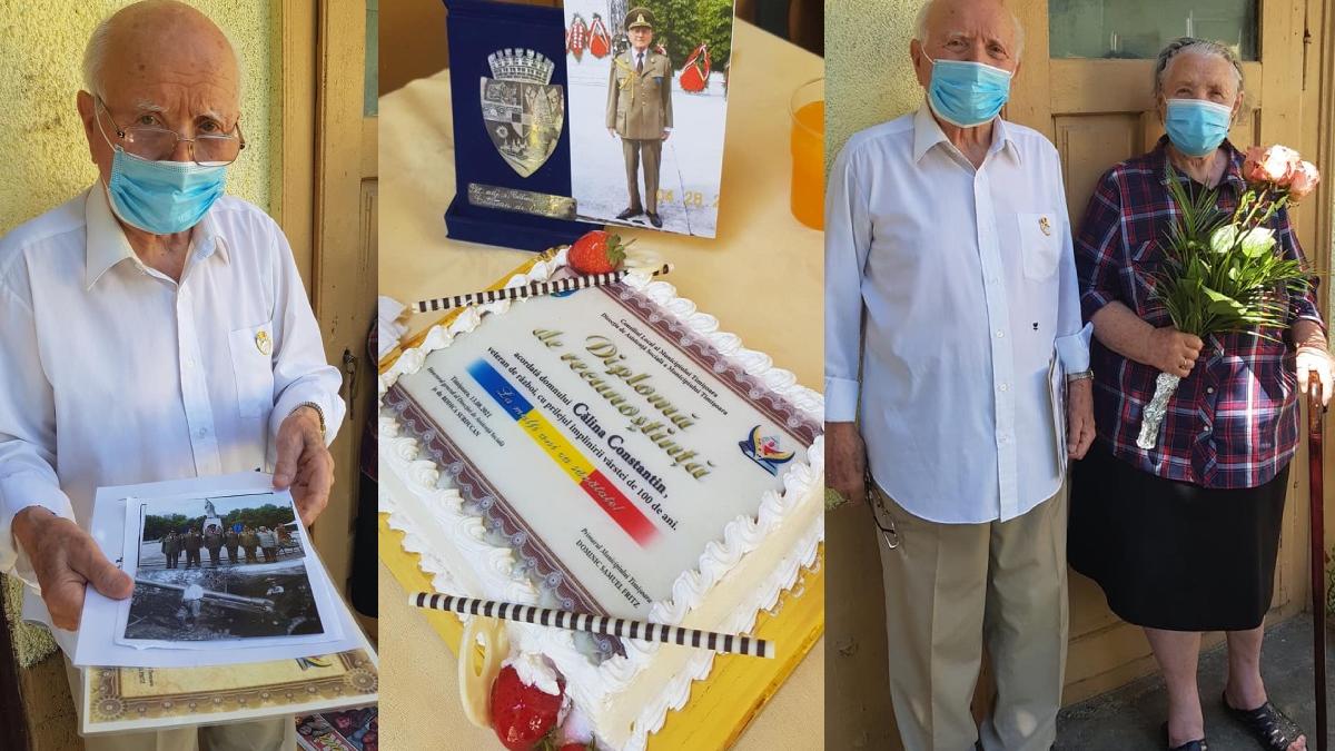 "Constantin Călina, un timişorean de cinste al oraşului, a împlinit astăzi venerabila vârstă de 100 de ani. Înconjurat de familie, domnul Constantin, veteran de război în Regimentul 6 Artilerie Grea român, a primit vizita surpriză a reprezentanţilor administraţiei publice locale.