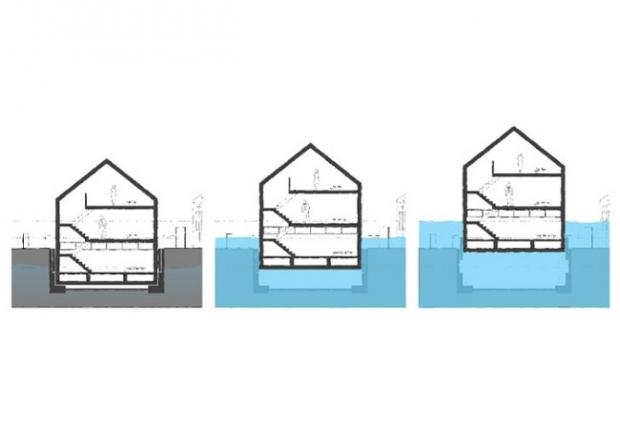 Casa propriu-zisa are o structura din lemn hidroizolata impecabil, insa secretul sta in fundatia din beton ce arata ca o cutie fixata in pamant si care se transforma intr-un bazin in momentul in care nivelul apei din zona creste. Pe masura ce bazinul respectiv se umple cu apa, casa se ridica si pluteste deasupra acestuia ca un ponton. Patru stalpi inalti din otel fixeaza casa din laterale, pentru a nu-i permite sa...