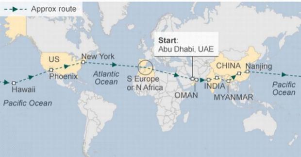 Călătoria în jurul lumii, efectuată la o altitudine de cel mult 8.500 de metri, va dura cinci luni şi va include 25 de zile de zbor efectiv. Revenirea avionului la Abu Dhabi este programată pentru sfârşitul lunii iulie-începutul lunii august.