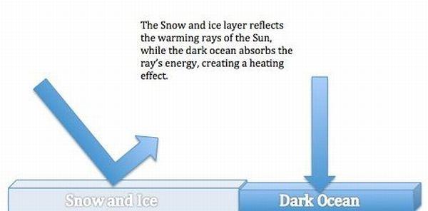 În timp ce gheaţa şi zăpada reflectă razele soarelui înapoi în spaţiu, apa oceanului absoarbe razele. Mai exact, pe măsură ce gheaţa se topeşte, regiunea Arctică devine un colector mai bun al energiei solare.