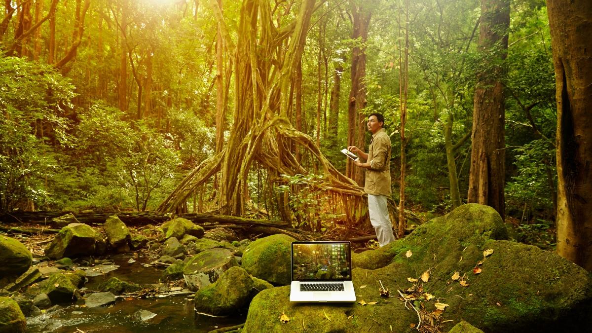 cercetatori car estudiaza inectele in padure cu laptop