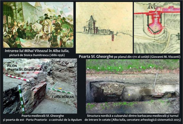 „În luna septembrie a anului în curs, echipa coordonată de dr. Anca Timofan, arheologă în cadrul Muzeului Naţional al Unirii Alba Iulia, a efectuat cercetări sistematice pe bastionul Capistrano care au dus la o descoperire excepţională, în zona estică a Cetăţii: ruinele porţii medievale Sf. Gheorghe, construite peste poarta principală (Porta Praetoria) a castrului legiunii a XIII-a Gemina. Descoperirea confirmă o continuitate strategică şi edilitară de-a lungul a două milenii în acelaşi punct-cheie al fortificaţiilor”, se arată într-un comunicat transmis de Muzeul Naţional al Unirii Alba Iulia, potrivit Agerpres.