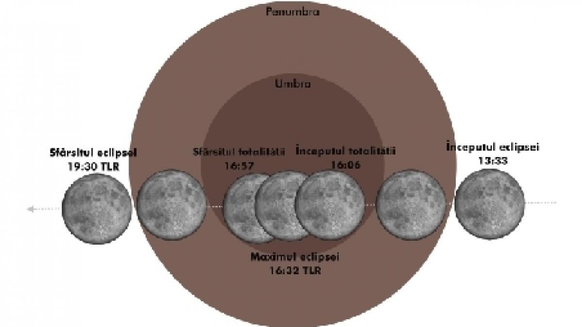 În acea zi, Luna va răsări la ora 16.30 şi vom putea vedea că este scufundată în umbra planetei noastre. Chiar atunci, spun specialiştii, se produce maximul eclipsei şi în următoarele 25 de minute Luna va rămâne în umbră.