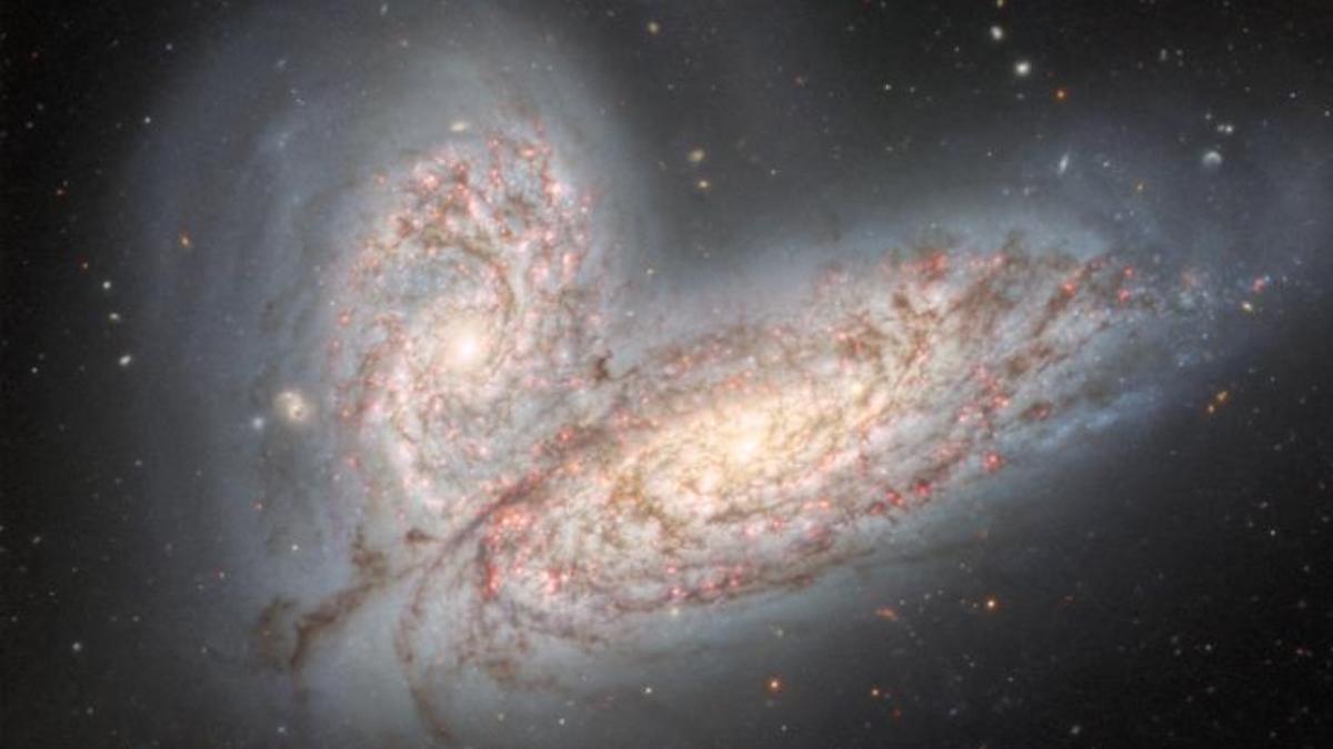 În timp, acestea vor "dansa" una în jurul celeilalte în cercuri care vor deveni din ce în ce mai mici. Acest "dans în buclă strânsă" va trage și va întinde fluxuri lungi de gaz și stele, amestecând cele două galaxii într-o formă care seamănă cu o sferă.