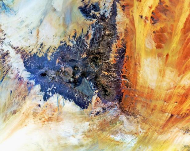 În partea stângă a imagini se poate vedea o depresiune (reprezentată prin culoarea albă, iar în dreapta (cu galben şi portocaliu) este deşertul Sahara.