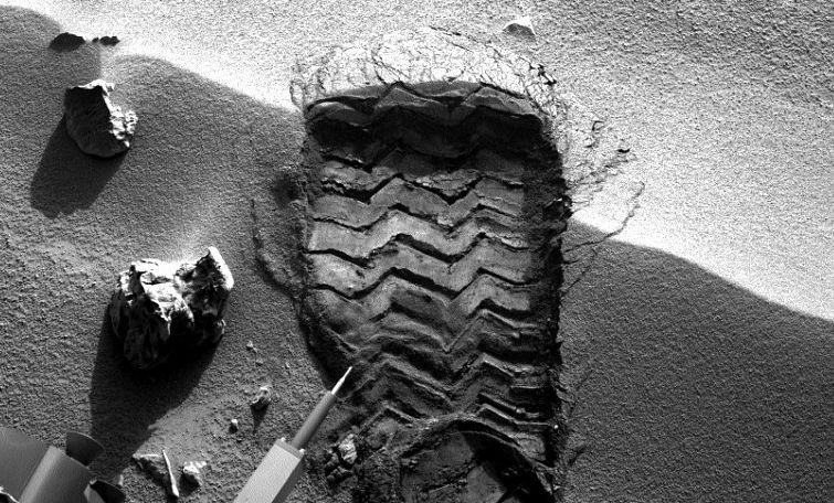 În imagine apare de fapt chiar urma lăsată de roverul Curiosity pe Planeta Roşie. Urma seamănă foarte mult cu cea lăsată de paşii unui om.