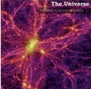 Un grup de astrofizicieni a folosit o simulare pe calculator pentru a demonstra cum s-a format şi a evoluat Universul. Cea de-a doua imagine prezintă modul în care arată Universul în prezent. Punctul galben din centru este un conglomerat de galaxii, înconjurat de stele şi materie neagră.