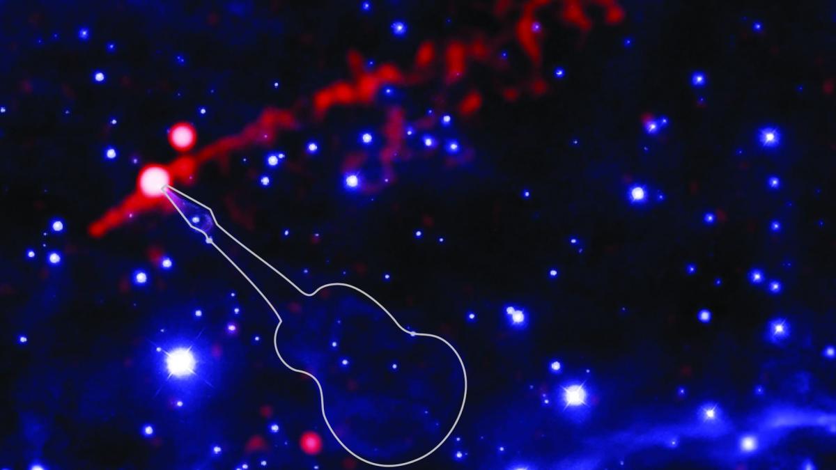 Jetul iese din pulsar perpendicular pe Nebuloasa Chitară, făcând să pară că torentul de foc iese din capul instrumentului.
