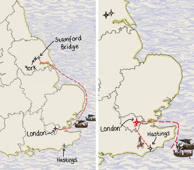 Pe scurt: Harold a navigat mai întâi cu flota sa spre nord, a spus Licence, unde l-a învins pe liderul viking Harald Hardrada și forțele sale norvegiene pe 26 septembrie 1066. Apoi s-a întors cu flota la Londra. „În loc să-și epuizeze oamenii în acel marș spre sud, care, desigur, a fost considerat responsabil pentru înfrângerea englezilor, el a avut ocazia să-i odihnească”, a adăugat Licence.
