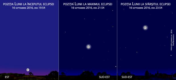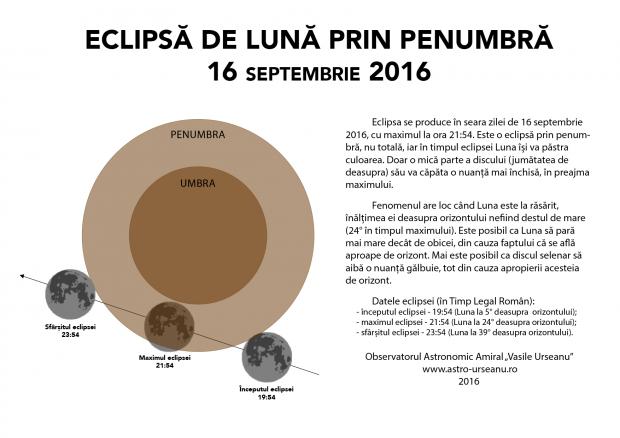În seara de 16 septembrie (vineri), la doar 30 de minute după ce Luna răsare la București, se va produce o eclipsă de Lună prin penumbră. Eclipsa începe la ora 19:54 și se termină la 23:54, timp în care Luna va străbate penumbra Pământului.