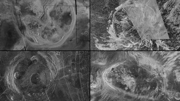 Cele mai recente dovezi se concentrează pe zeci de caracteristici mari, în formă de inel, de pe suprafața lui Venus. Aceste caracteristici, cunoscute sub numele de coronae, se formează atunci când pâlcuri de roci fierbinți se ridică din adâncul mantalei, împingând scoarța în sus. Pe măsură ce suprafața se răcește și se prăbușește, o structură circulară este lăsată în urmă.