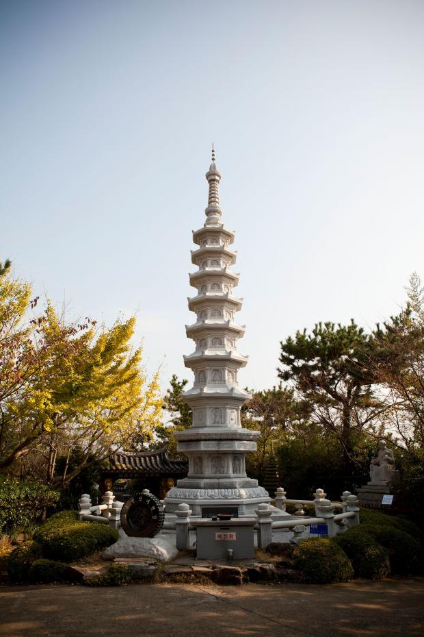 După ce coboară cele 108 trepte tradiționale spre templu, trecând pe lângă statuile celor 12 animale ale zodiacului chinezesc, vizitatorii observă în stânga o pagodă albă înaltă. Indicatoarele în coreeană și engleză o numesc Pagoda Siguranței în Trafic.