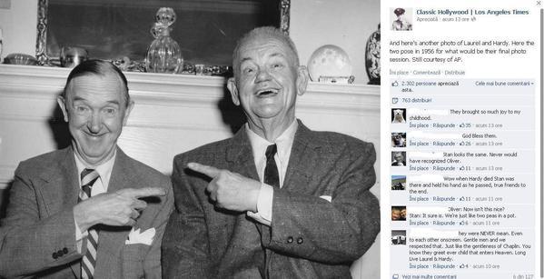 Stan şi Bran au fost cei care au pus bazele comediei cinematografice, iar Los Angeles Times a postat pe contul de socializare al publicaţiei ultima fotografie cu cei doi comedieni.