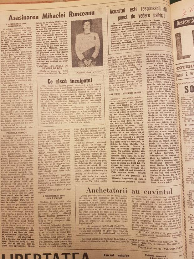 "Am cunoscut-o pe Barbu Ioana zisă Giulia la sfârşitul lui februarie 1989. Ne-am împrietenit rapid, am stabilit pe loc ca să trăim în concubinaj. Ea era divorţată, avea un băiat de şapte ani. M-am mutat la ea. În luna mai i-am spus să nu se mai ducă la serviciu. Era telefonistă, avea o muncă grea. Eu eram, recunosc, şi foarte gelos. Părinţii mei, care sunt ingineri, mi-au promis că o vor ajuta să-şi găsească o altă ocupaţie. Cu timpul, am început s-o ducem greu cu banii, trăiam doar din leafa mea de mecanic, la Schela de foraj Chitila. Au început certurile, Giulia a vrut să termine legătura cu mine. Nu puteam admite aşa ceva. La începutul lui octombrie mi-a spus că a rămas restantă la plata apartamentului proprietate personală cu suma de 5.800 lei. Nu aveam de unde să fac rost de aceşti bani, vroiam să-i ofer o viaţă cât mai deosebită. Prin urmare m-am hotărât s-o ucid şi s-o jefuiesc pe Mihaela Runceanu, pe care o cunoscusem printr-o prietenă comună şi pe care o vizitasem de câteva ori aducându-i casete, unele luate de la părinţii mei. Ştiam că are lucruri: video, TV color... ....Am fixat ziua de 31 octombrie. M-am dus la domiciliul părinţilor şi l-am rugat pe tata să-mi împrumute o casetă şi maşina. Am sunat-o apoi pe Mihaela, autoinvitându-mă la vizionarea casetei. M-a refuzat. După o jumătate de oră, am sunat iarăşi. A acceptat s-o vizitez. Era ora 21,30. Ne-am uitat la video, apoi a apărut Maria Sîmbeteanu. S-a certat cu Mihaela, care i-a cerut să părăsească casa. Mi-a spus şi mie să plec. Am rugat-o să mă lase să dorm acolo, minţind-o că mă gonise tata de-acasă pentru că îi luasem caseta aceea. A acceptat, mi-a permis să dorm pe un fotoliu, ea culcându-se în pat. După circa 30 de minute, când am crezut că adormise, m-am sculat, mi-am pus mănuşi şi am încuiat uşa. M-am apropiat de pat.. Mihaela s-a trezit instinctiv. Am strâns-o de gât până nu a mai mişcat. Eram convins că a murit. Am stat cîteva clipe dezorientat. La un moment dat, Mihaela a început să mişte. M-am repezit la telefon, am tăiat o bucată de cablu, i l-am petrecut în jurul gâtului şi am strâns puternic. Am început să adun lucrurile, le-am transportat în maşină. Am găsit pe balcon o canistră. Am golit-a aproape toată în rezervorul maşinii tatălui meu. Restul de benzină l-am turnat pe pat pe covor. Le-am aprins şi am plecat. Credeam că nu vor mai există urme. Lucrurile le-am dus la Giulia. I-am povestit totul. Am hotărât ca o parte să le vindem. Asta e tot..." ( Ziarul Libertatea, 1990, octombrie)