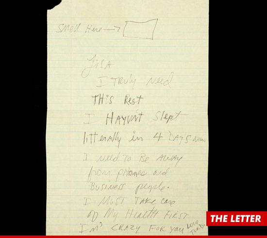 "Lisa, trebuie neapărat să mă odihnesc. Sunt patru zile deja de când nu am mai dormit deloc. Trebuie să las deoparte afacerile şi telefoanele. Trebuie să am grijă de sănătatea mea în primul rând. Sunt nebun după tine. Cu dragoste, Turd."