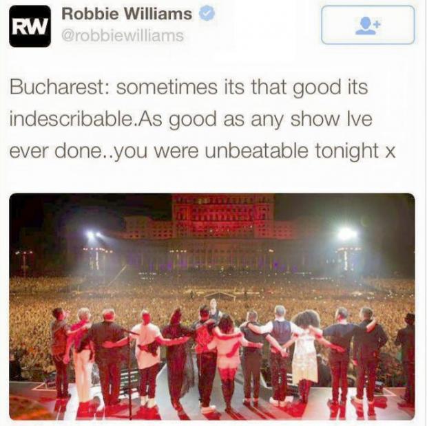Şi Robbie Williams a fost impresionat de români şi şi-a arătat recunoştinţa pe reţelele sociale.
