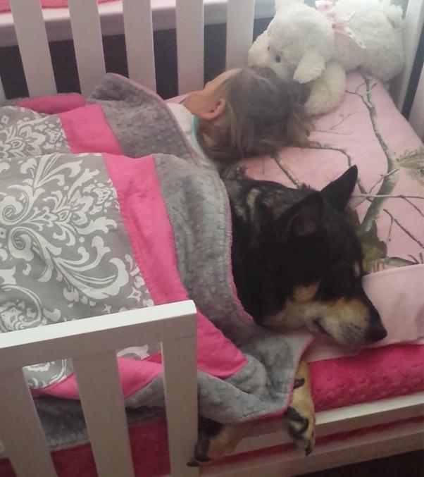 Când Kristin Leigh Rhynehart, o americancă din North Carolina, a intrat în camera fetiţei ei, Addison, a descoperit că cineva o avea deja în grijă. În filmuleţul postat de ea pe Youtube se vede cum câinele familiei, Raven s-a instalat protector lângă copil şi a adormit acolo.