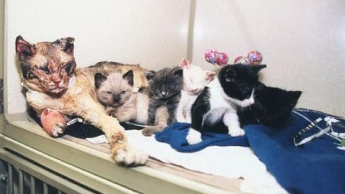 Pisica mamă a rămas cu urme adânci ale incendiului dar a fost adoptată la scurt timp de o femeie care, la rândul ei, a fost salvată dintr-un incendiu.