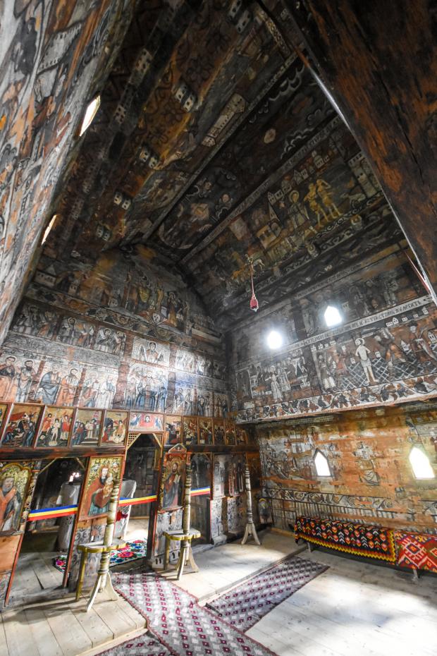 Altarul şi alte detalii din interiorul Bisericii de lemn din Ieud Deal, care a fost inclusă de UNESCO, în 1999, pe lista monumentelor cu valoare de patrimoniu cultural mondial, împreună cu alte șapte lăcaşuri de cult din lemn din Maramureș. Sursa foto: Getty Images