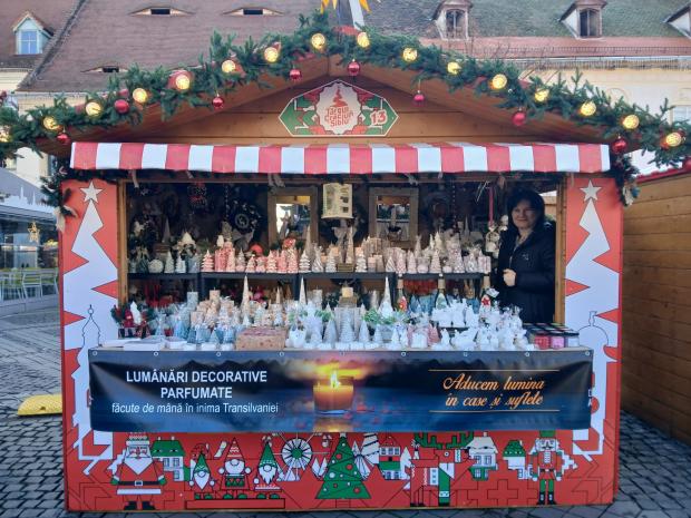 Mi se opresc ochii la o căsuță plină cu lumânări de Crăciun. De la brăduți, stele și globuri la modele complicate de reni, trăsuri și chiar lumânări turnate în sticle de vin. Fiecare lumânare de aici este făcută de mână. Procesul durează între zece ore și două zile, în funcție de model. Pentru un brăduț, în atelierul Darialex, se lucrează o zi și jumătate. Cristina Bota vine de opt ani din Ocna Mureș la Sibiu, la Târgul de Crăciun. Este însoțită de soțul ei, iar în zilele de Crăciun vin și copiii. A devenit deja tradiție să sărbătorească Crăciunul departe de casă, printre sibieni.