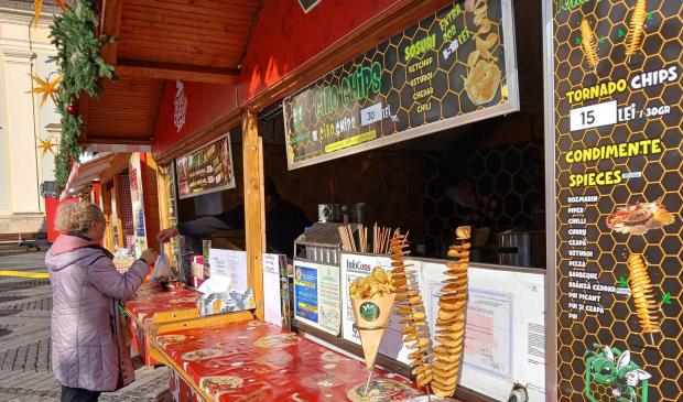Am mers și noi la căsuța cu faimosul cartof spiralat. Proprietara vine la Târgul de Crăciun din Sibiu din Giurgiu de șapte ani. E înfuriată de nedreptatea ce i s-a făcut. Cu atât mai mult cu cât este vorba despre produsul ei cel mai popular.