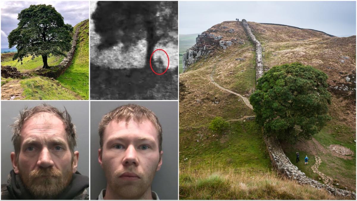 Daniel Michael Graham, în vârstă de 39 de ani, și Adam Carruthers, în vârstă de 32 de ani, ambii din Cumbria, au fost condamnați pentru daune penale după ce s-au filmat folosind un ferăstrău cu lanț pentru a tăia în mod ilegal copacul emblematic de lângă Zidul lui Hadrian din Northumberland.