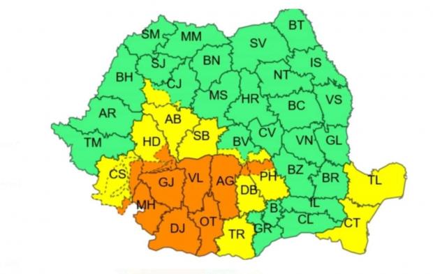 Codul portocaliu va fi valabil timp de 24 de ore, începând de sâmbătă, la ora 14:00. Pericol este pe râurile din bazinele hidrografice Dunăre – afluenţii mici aferenţi sectorului amonte confluenţă cu râul Desnăţui (judeţele Caraş Severin, Mehedinţi şi Dolj), Desnăţui (judeţele Mehedinţi şi Dolj), Jiu – bazin amonte S.H. Răcari şi afluenţii aferenţi sectorului aval S.H. Răcari – amonte S.H. Podari (judeţele Hunedoara, Gorj, Mehedinţi şi Dolj), Lotru – bazin amonte Ac. Vidra şi afluenţii aferenţi sectorului aval Ac. Vidra, Olt – afluenţii aferenţi sectorului aval confluenţă cu râul Lotru (judeţele Vâlcea, Gorj, Argeş, Olt şi Dolj), Călmăţui (judeţele Olt şi Teleorman), Argeş – bazin superior, Dâmboviţa – bazin superior (judeţele Argeş şi Dâmboviţa), Ialomiţa – bazin amonte S.H. Pucioasa şi afluenţii aferenţi sectorului aval S.H. Pucioasa – amonte S.H. Siliştea Snagovului (judeţele Dâmboviţa, Prahova şi Ilfov), Prahova – bazin amonte S.H. Prahova, Teleajen (judeţul Prahova).