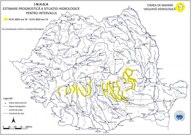 Potrivit hidrologilor, se pot produce scurgeri importante pe versanţi, torenţi şi pâraie, viituri rapide pe râurile mici cu posibile efecte de inundaţii locale şi creşteri de debite şi niveluri pe unele râuri din bazinele hidrografice Jiu, Olt, Dâmboviţa, Ialomiţa, Buzău, Rm. Sărat și Putna, cu posibile depăşiri ale cotelor de atenție.