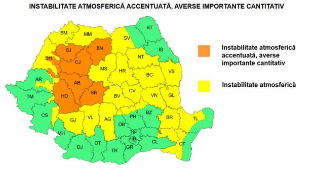 În județele Hunedoara, Alba, Sibiu, Cluj, Sălaj, Bistrița-Năsăud și zona de munte a județului Bihor vor fi averse importante cantitativ, frecvente descărcări electrice, intensificări ale vântului (rafale de 50...70 km/h) și grindină. În intervale scurte de timp sau prin acumulare, cantitățile de apă vor fi de 40...50 l/mp și izolat de peste 60 l/mp.