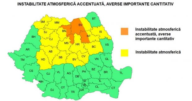 În Transilvania, nordul Olteniei, nord-vestul Munteniei, în nordul Crișanei, în Maramureș și în cea mai mare parte a zonei montane vor fi perioade cu instabilitate atmosferică, ce se va manifesta prin averse torențiale, descărcări electrice, intensificări ale vântului (rafale de 50...60 km/h) și izolat grindină de mici dimensiuni. În nord-estul Munteniei, partea continentală a Dobrogei și local în Moldova, în special după-amiaza și seara vor fi vijelii (cu rafale de 60...75 km/h), grindină de mici și posibil medii dimensiuni (1...3 cm) și averse torențiale. În intervale scurte de timp sau prin acumulare, cantitățile de apă vor fi de 20...30 l/mp și pe arii restrânse de peste 40 l/mp.