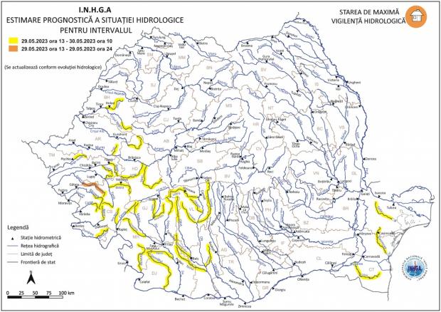 Institutul Național de Hidrologie și Gospodărire a Apelor (INHGA) e emis, luni, două avertizări Cod galben și una Cod portocaliu care anunță scurgeri importante pe versanţi, torenţi şi pâraie, viituri rapide pe râurile mici cu posibile efecte de inundaţii locale şi creşteri de debite şi niveluri, cu posibile depăşiri ale cotelor de apărare pe râuri din județele Bihor, Arad, Hunedoara, Timiş, Caraş-Severin, Gorj, Mehedinţi, Dolj, Sibiu, Vâlcea, Argeş, Olt, Constanţa şi Tulcea.