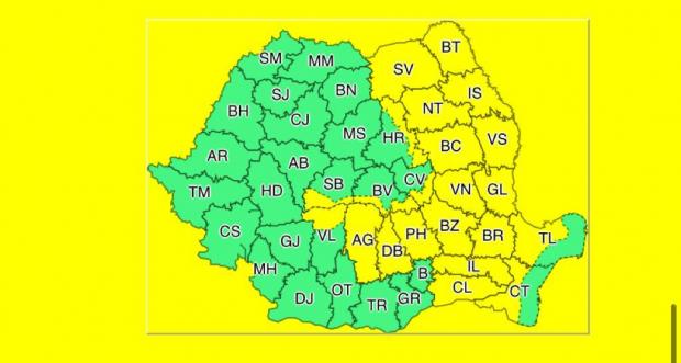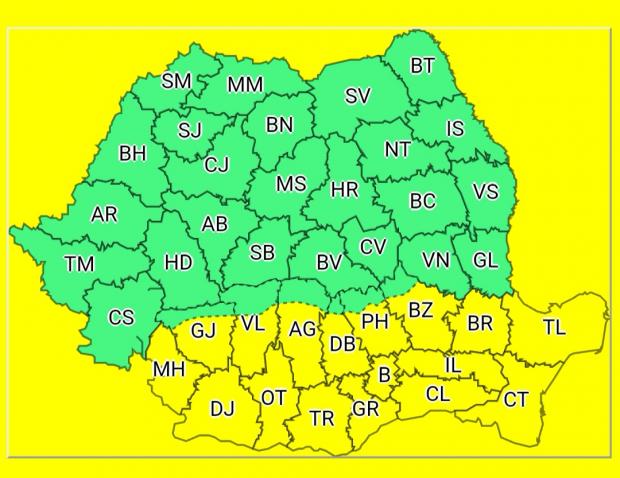 ANM a emis, în această dimineaţă, două alerte meteo de tip cod galben pentru jumătatea de sud a ţării, precum şi una pentru jumătatea de est.