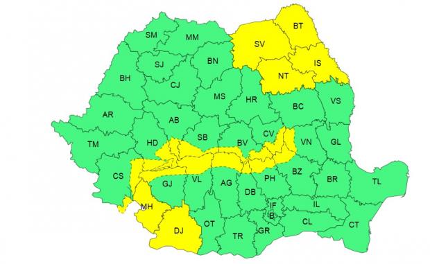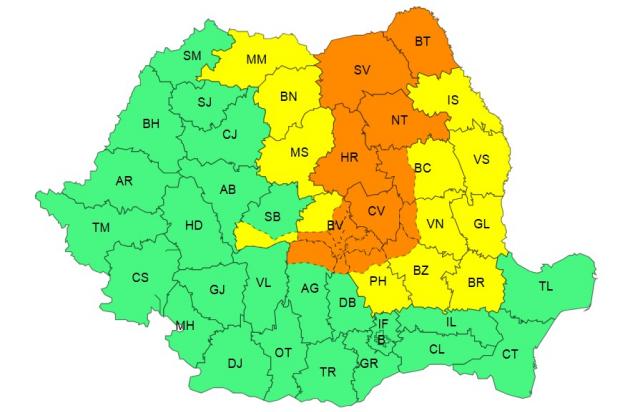 În județele Suceava, Botoșani, Neamț, Harghita, Covasna și zona montană a județelor Argeș, Dâmbovița, Prahova, Buzău, Vrancea, Bacău și Brașov va continua să plouă important cantitativ și se vor acumula 30...40 l/mp și izolat peste 50 l/mp