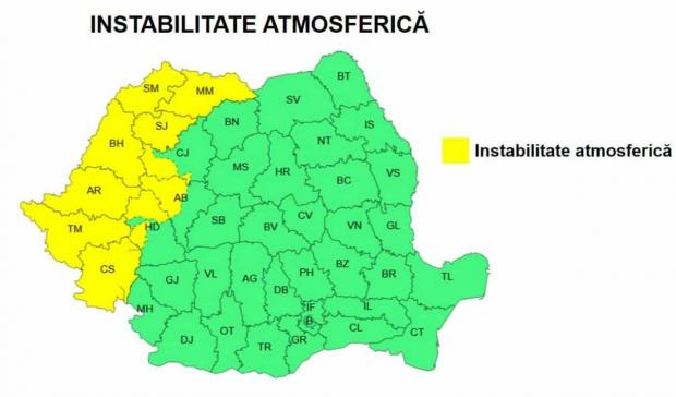 Se vor semnala: averse torențiale care vor acumula 25...40 l/mp, frecvente descărcări electrice, intensificări ale vântului de 50...70 km/h, izolat grindină de 2-4 cm.