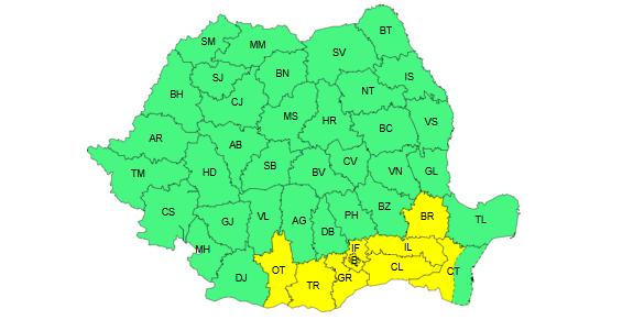 În sud-estul Olteniei, în sudul și în estul Munteniei, precum și în sud-vestul Dobrogei va fi caniculă și disconfort termic ridicat, iar indicele temperatură-umezeală (ITU) va atinge sau va depăși ușor pragul critic de 80 de unități. Temperaturile maxime vor fi de 35...36 de grade. Până la mijlocul săptămânii, local va fi caniculă și disconfort termic ridicat în sudul și în sud-estul țării, a mai precizat ANM.