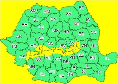 Judeţele vizate de atenţionarea Cod galben sunt: Vrancea, Buzău, Prahova, Dâmboviţa, Argeş, Vâlcea, Gorj, Caraş-Severin, Hunedoara, Alba, Sibiu, Braşov şi Covasna.