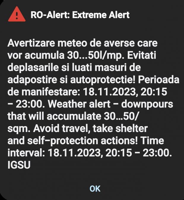 Oamenii din zonă au primit deja mesaj Ro-Alert. "Avertizarea meteo de averse care vor acumula 30-50l/mp. Evitați deplasările și luați măsuri de adăpostire și autoprotecție! Perioada de manifestare:18.11.2023, 20.15-23.00", se arată în mesajul Ro-Alert.