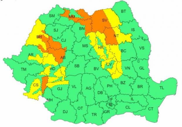 Fenomene și zone vizate: viscol puternic și vizibilitate sub 50 m la altitudini de peste 1700 m în Munții Apuseni, nordul Carpaților Orientali și în vestul Carpaților Meridionali