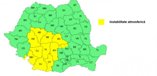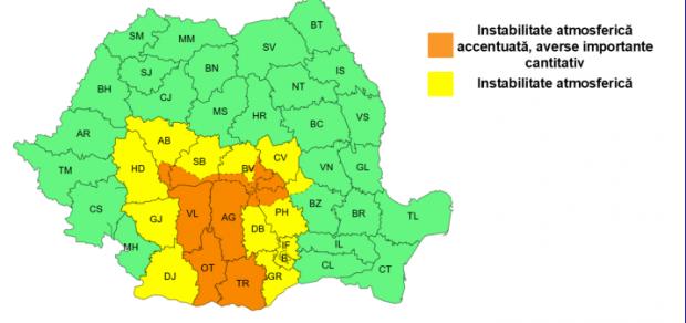 Sunt vizate județele Vâlcea, Olt, Argeș, Teleorman, precum și zona de munte a județelor Alba, Sibiu, Brașov, Dâmbovița și Prahova, unde vor fi averse importante cantitativ, frecvente descărcări electrice și pe arii restrânse intensificări puternice ale vântului (rafale de 70...90 km/h) și grindină de medii și posibil mari dimensiuni (3 - 5 cm). În intervale scurte de timp sau prin acumulare, cantitățile de apă vor fi de