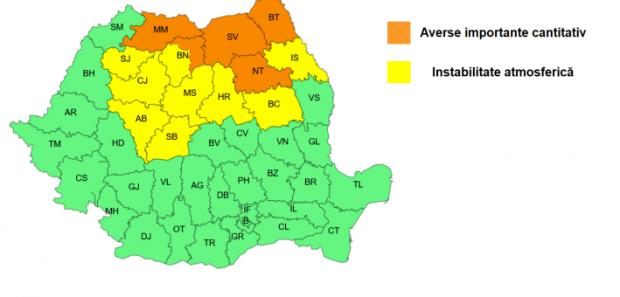 Luni dimineață, până la ora 10.00 vor fi valabile un cod portocaliu și unul gaben de instabilitate atmosferică. Cel galben va viza cea mai mare parte a Transilvaniei, local centrul Moldovei, unde vor fi perioade cu instabilitate atmosferică ce se va manifesta prin averse torențiale, descărcări electrice, intensificări ale vântului (rafale de 50...55 km/h) și izolat grindină de mici dimensiuni (1 – 2 cm). În intervale scurte de timp sau prin acumulare, cantitățile de apă vor fi de 20...25 l/mp și izolat de peste 35...40 l/mp.