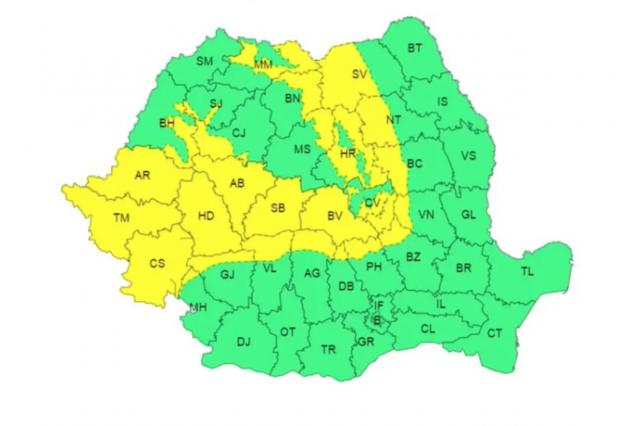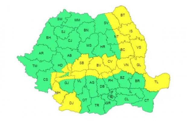 Meteorologii au emis și o avertizare cod galben valabilă de astăzi, ora 22:00, până mâine, la aceeași oră.