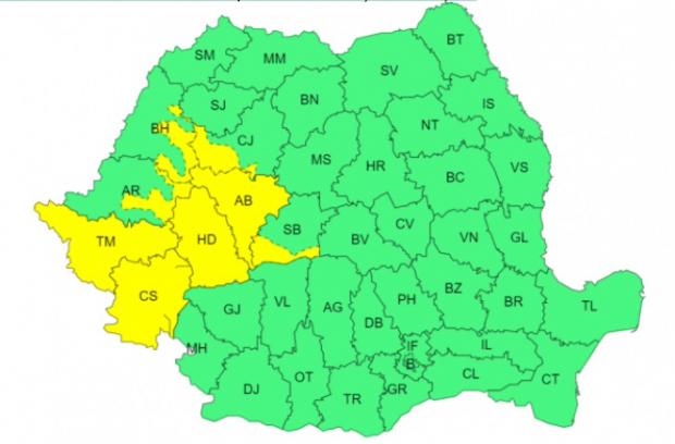 În intervalul menționat, vor fi perioade cu instabilitate atmosferică accentuată care se va manifesta prin averse torențiale și pe arii restrânse descărcări electrice, în Carpații Occidentali, vestul Carpaților Meridionali, sud-vestul Transilvaniei și local în Banat.