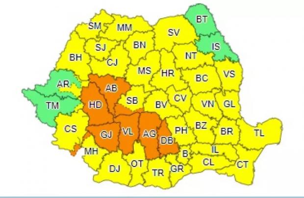 Codul portocaliu vizează județele Alba, Hunedoara, Gorj, Vâlcea, Argeș, Dâmbovița și parțial județele Mehedinți și Sibiu.