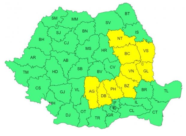 Administrația Națională de Meteorologie a emis o avertizare Cod galben de ploi şi vijelii pentru cea mai mare parte a Moldovei și nordul Munteniei.